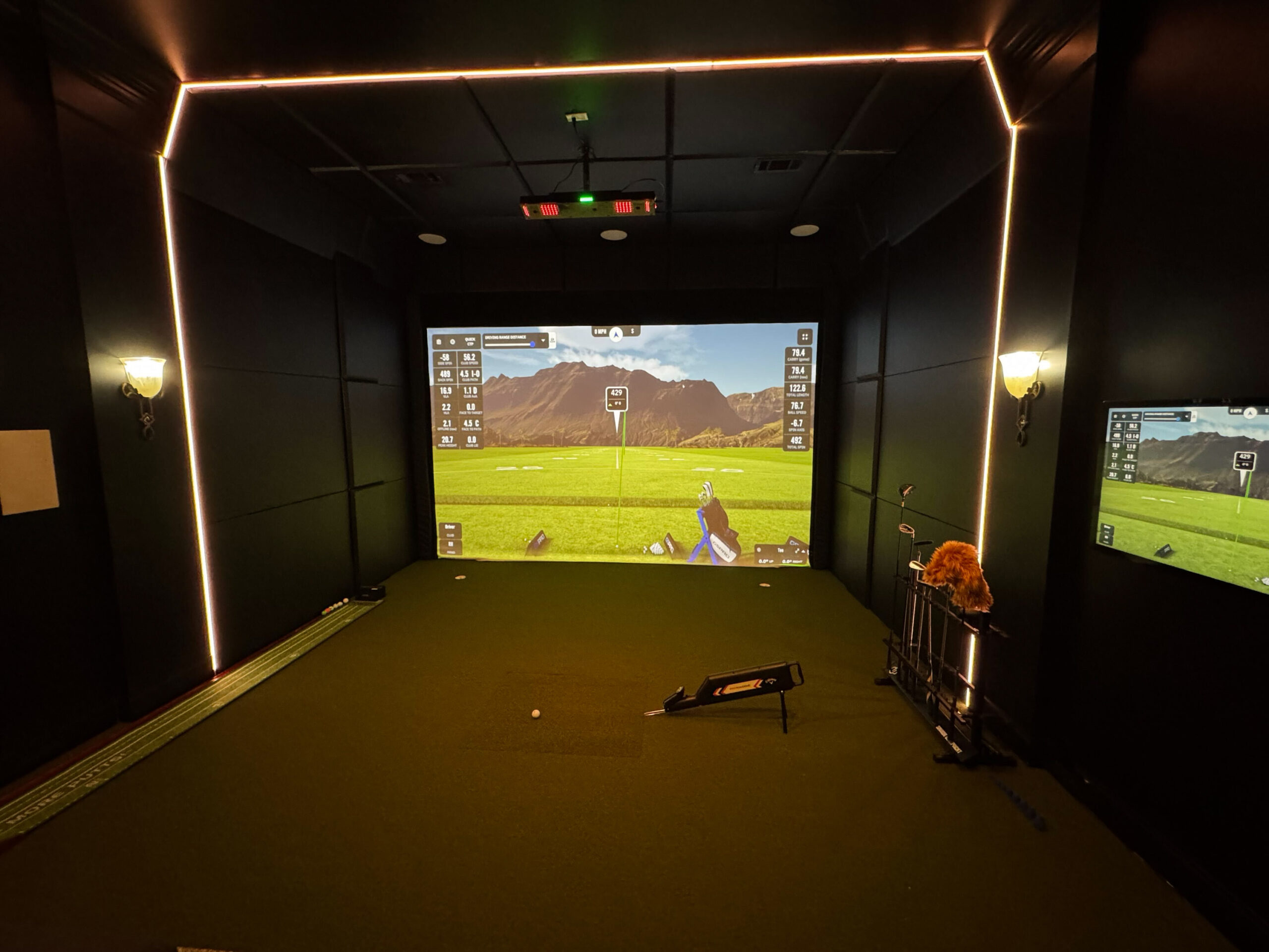 From the moment you step into the space, everything shifts. The dark finishes, controlled lighting, and clean layout create an environment that feels focused, immersive, and purpose-built—whether you’re grinding through practice reps or playing a full round.
